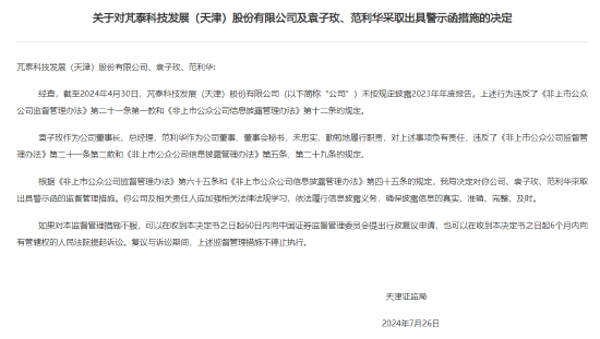7月30日电,天津证监局发布了对芃泰科技发展(天津)股份有限公司(以下简称“芃泰科技”)非常董事长、总司理袁子玫,董事、董事会通知范利华领受出具警示函监督责罚措施的决定。这一决定源于芃泰科技未能在王法时代内暴露2023年年度阐发,违背了有关信息暴露法子。