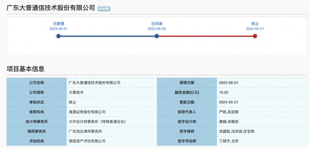 5月22日,上海证券往复所(简称“上交所”)网站裸露,因广东大平庸信技能股份有限公司(简称“大普技能”)过甚保荐东谈主胆怯刊行上市央求,上交所休止其刊行上市审核。