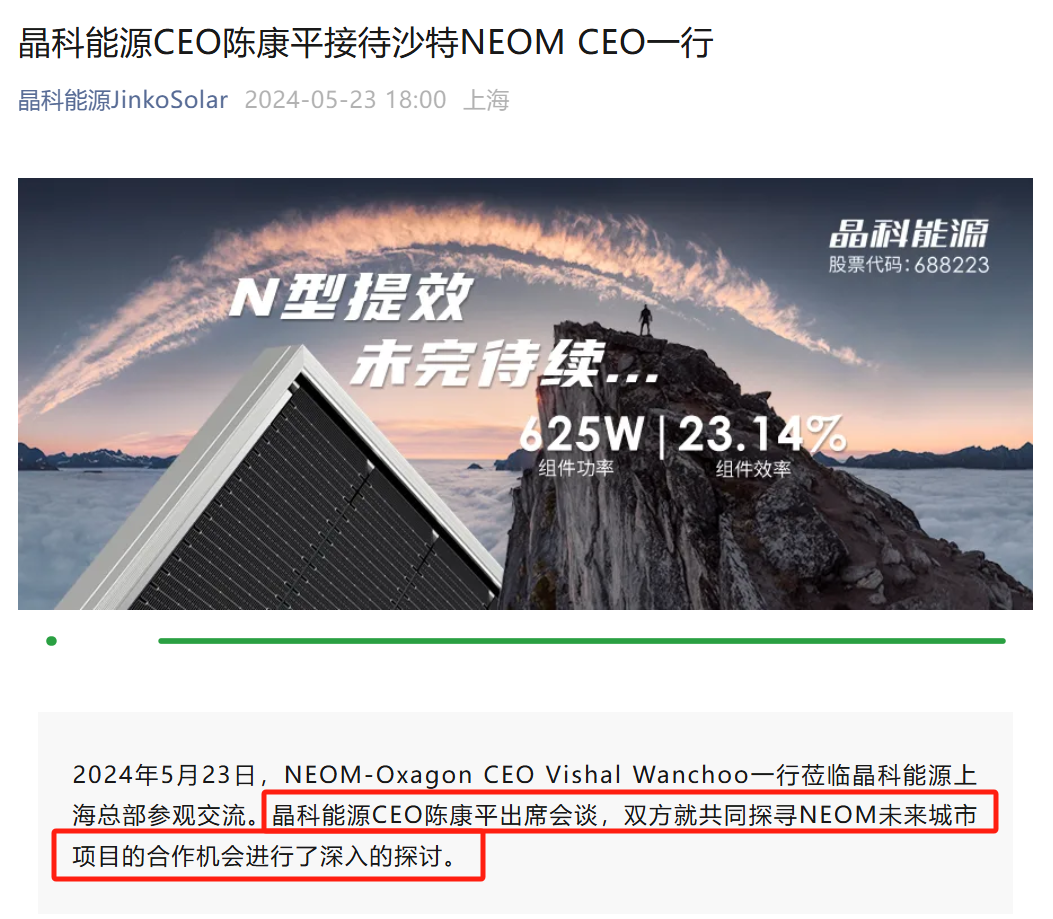 据晶科动力(688223)官微,2024年5月23日,NEOM-Oxagon CEO Vishal Wanchoo一溜驾临晶科动力上海总部参不雅调换。